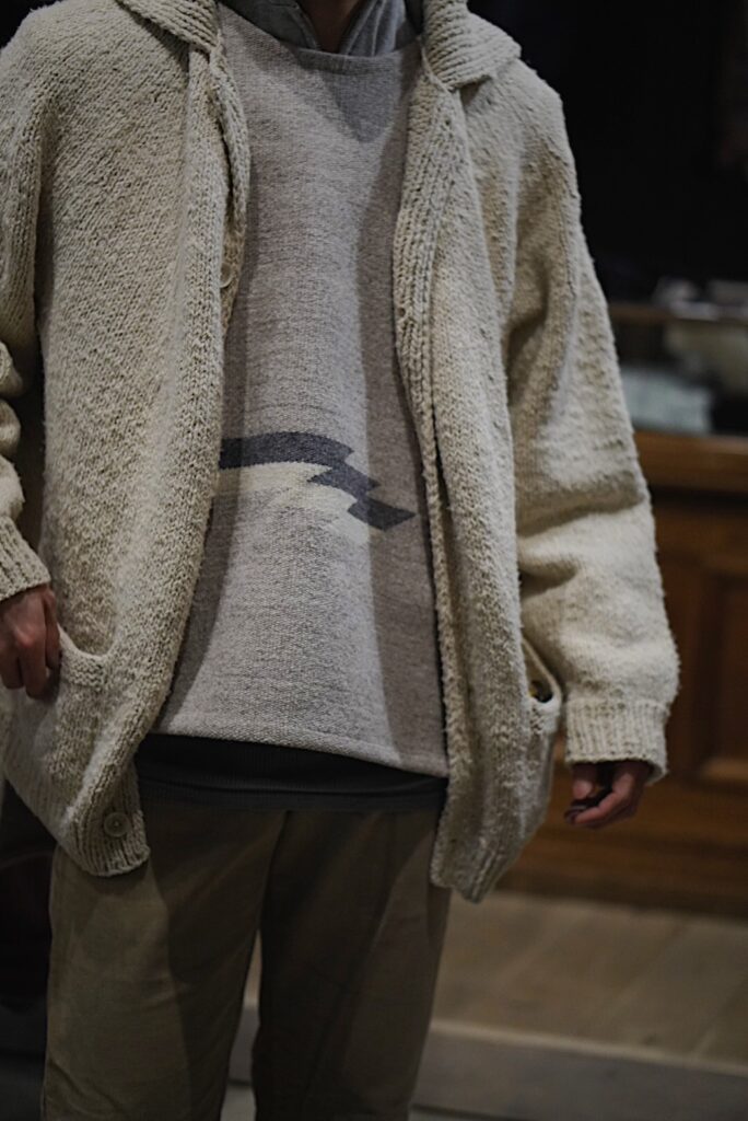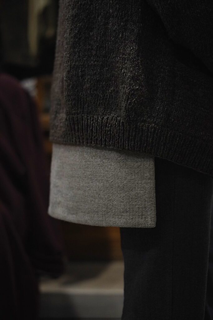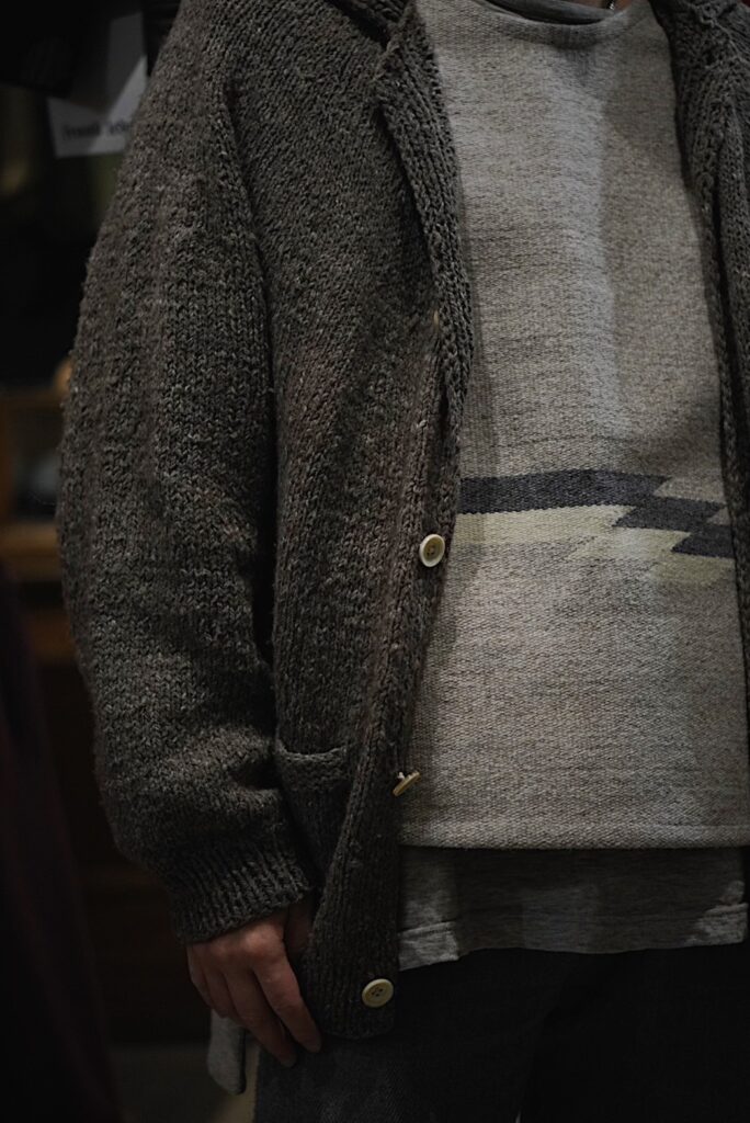 rdv o globe のヤクウールのカットソーにチマヨベスト、その上に YANABA の手紡ぎ手編みのニット。